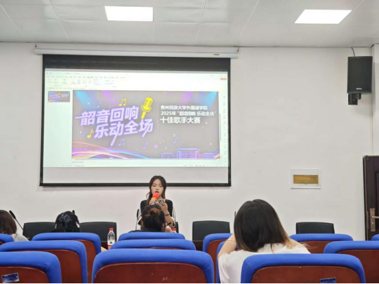 10月10日晚上18点,贵州民族大学“韶音回响 乐动全场”十佳歌手大赛外国语学院初赛在416室举行。此次活动由学院团委主办、团委学生会协办,旨在认真落实校级赛事部署、丰富校园文化。