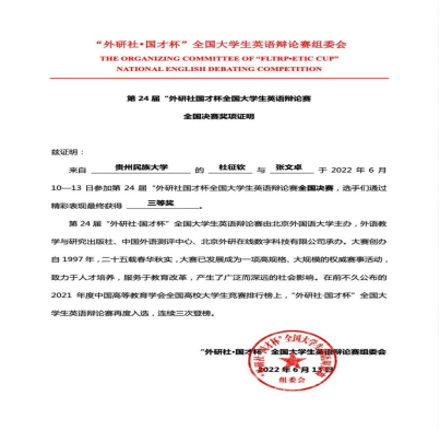 2022年6月13日,我校2020级法学专业的张文卓同学和2020级英语专业的杜征钦同学,在外国语学院胡静老师的悉心指导下,经过3天8轮的激烈比拼,在第24届“外研社·国才杯”全国大学生英语辩论赛中荣获国家级三等奖,贵州民族大学成为贵州省唯一晋级全国总决赛并荣获国奖的高校。