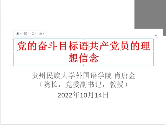 根据学校关于入党积极分子培训的通知要求及工作实际,2022年10月14日,外国语学院院长肖唐金教授带领积极分子一起线上学习了党的奋斗目标与共产党员的理想信念。