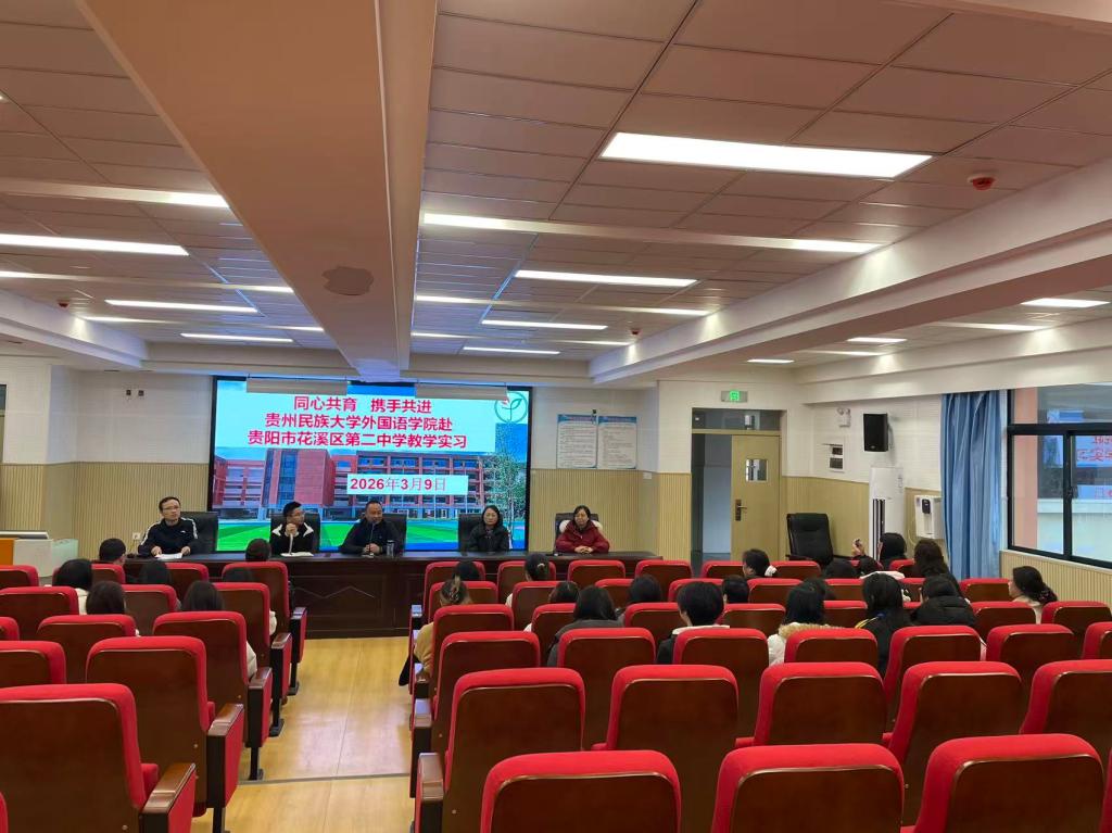 为切实提升学院英语专业学生实践教学能力,深化校地协同育人机制,2026年3月9日上午,贵州民族大学外国语学院2022级英语专业的18名同学,在罗兰老师和国天琴老师的带领下,前往贵阳市花溪区第二中学,开启为期2个月的教育实习活动。